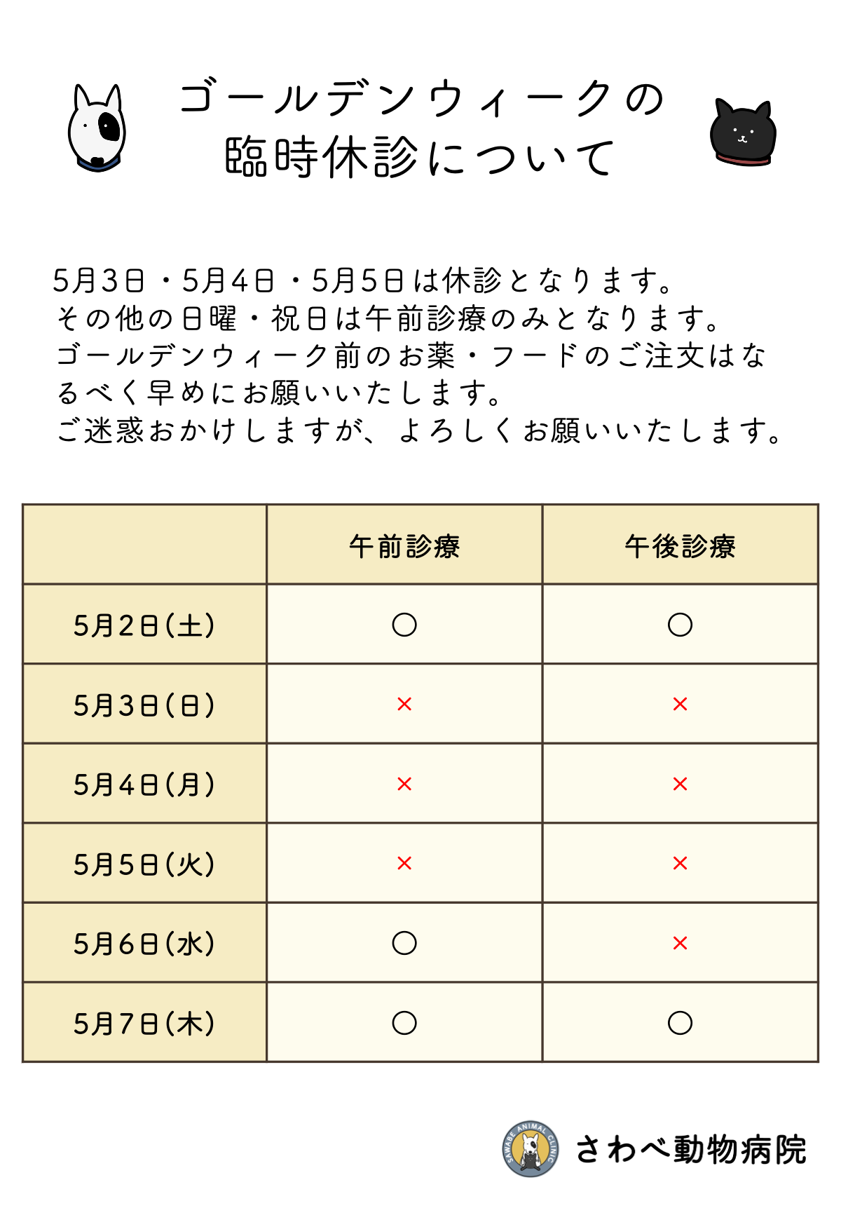5月3日(日)、5月4日(月)、5月5日(火)は休診日となります。その他の日曜・祝日は午前診療のみとなります。ゴールデンウィーク前のお薬・フードのご注文はなるべく早めにお願いいたします。ご迷惑おかけしますが、よろしくお願いいたします。